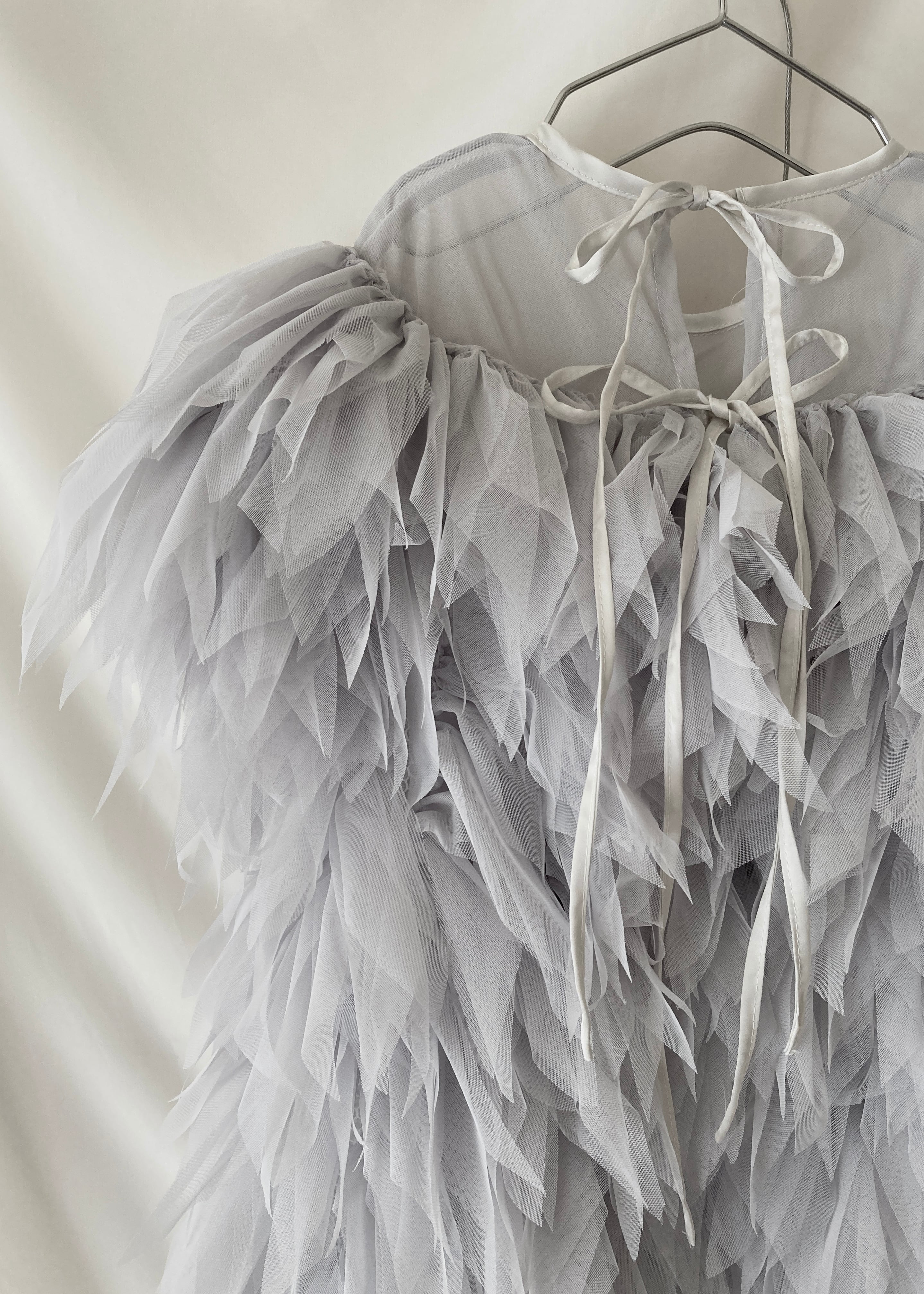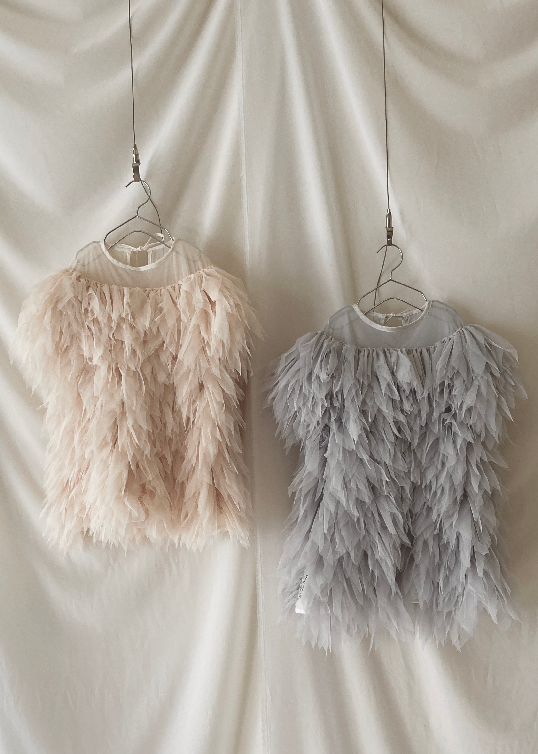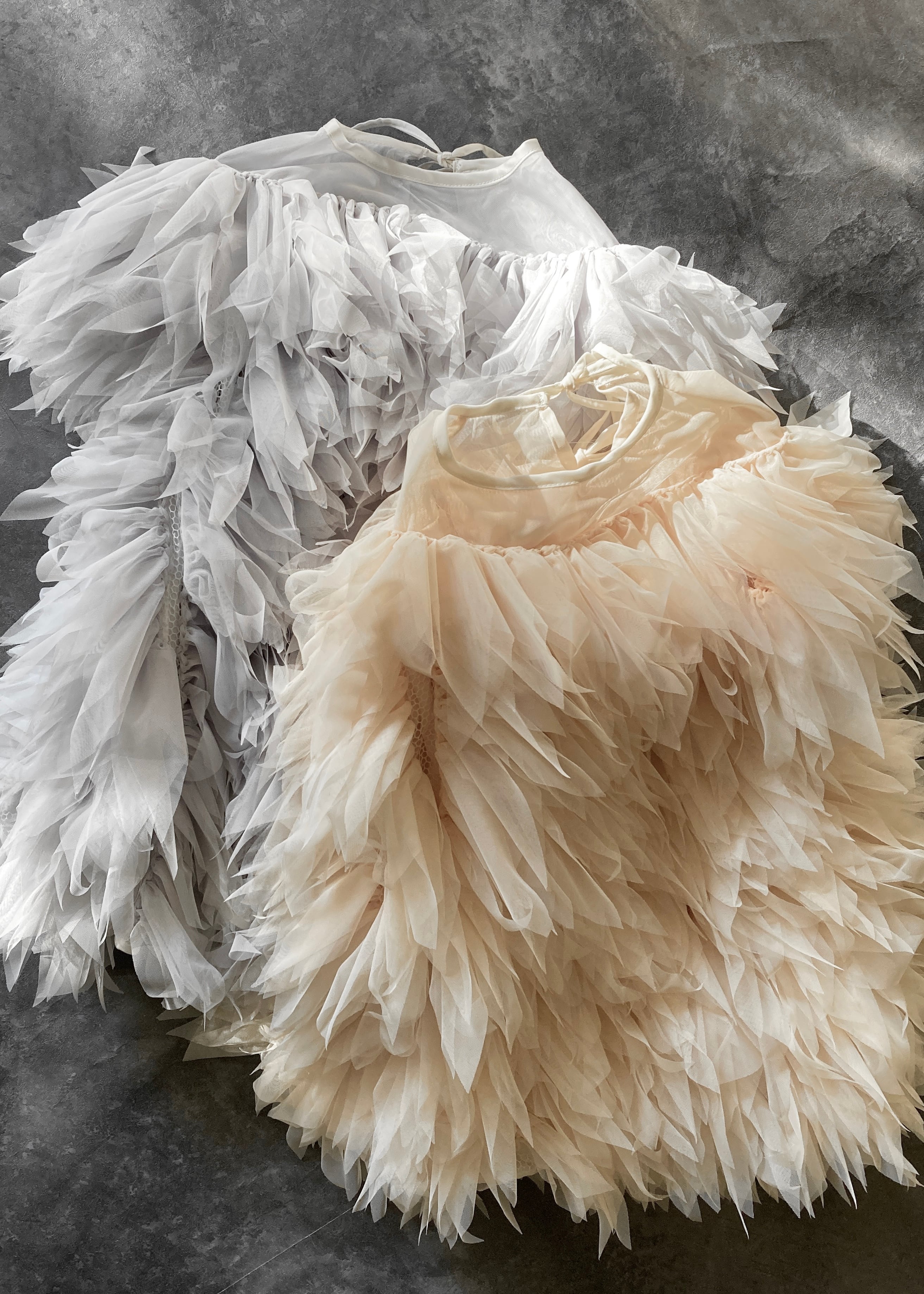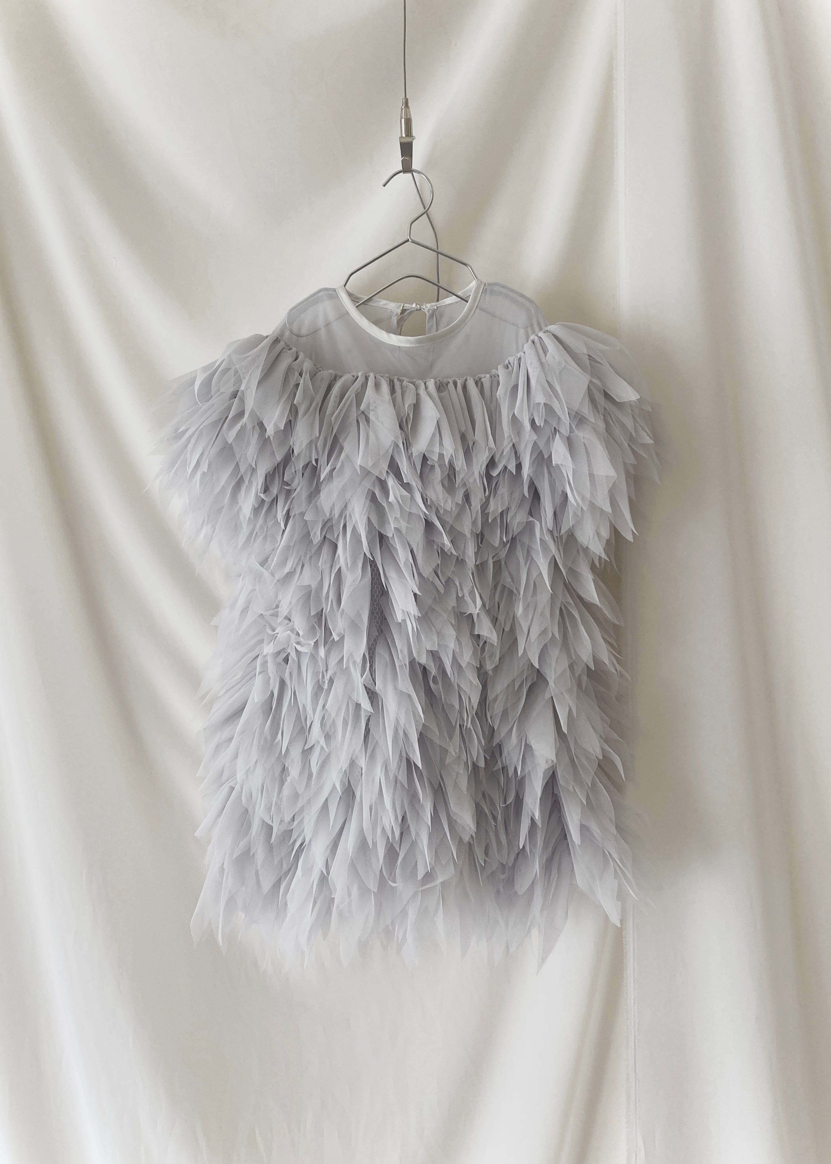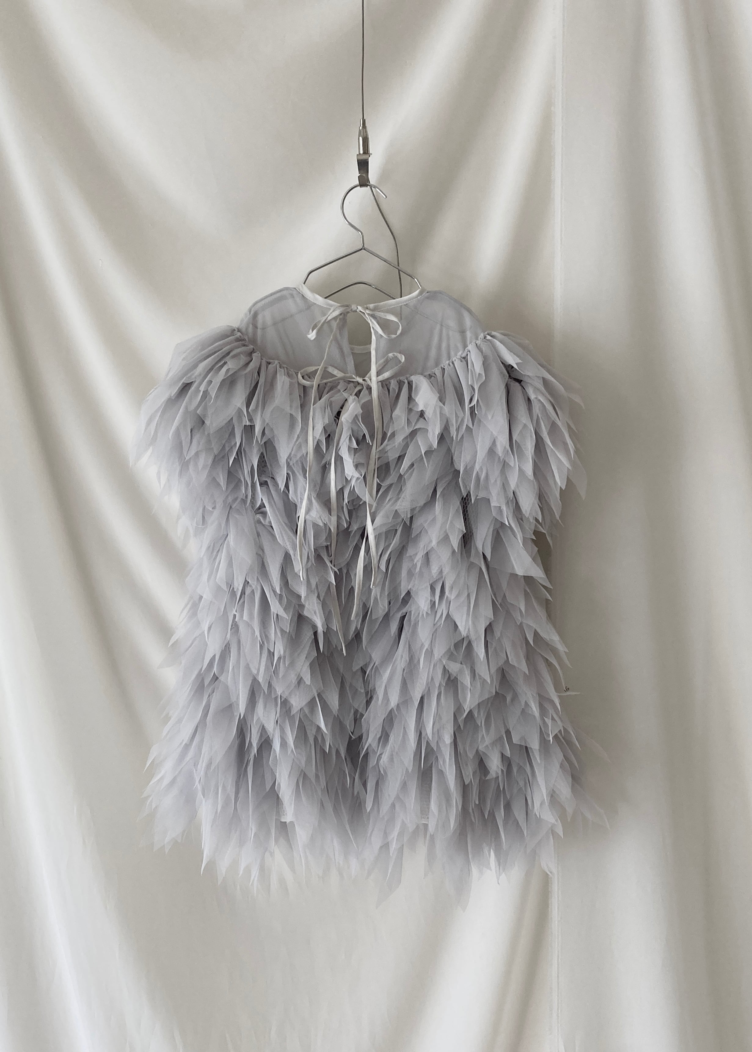 羽のようにカットしたチュール生地を、ニットのように編み込んで制作しています。