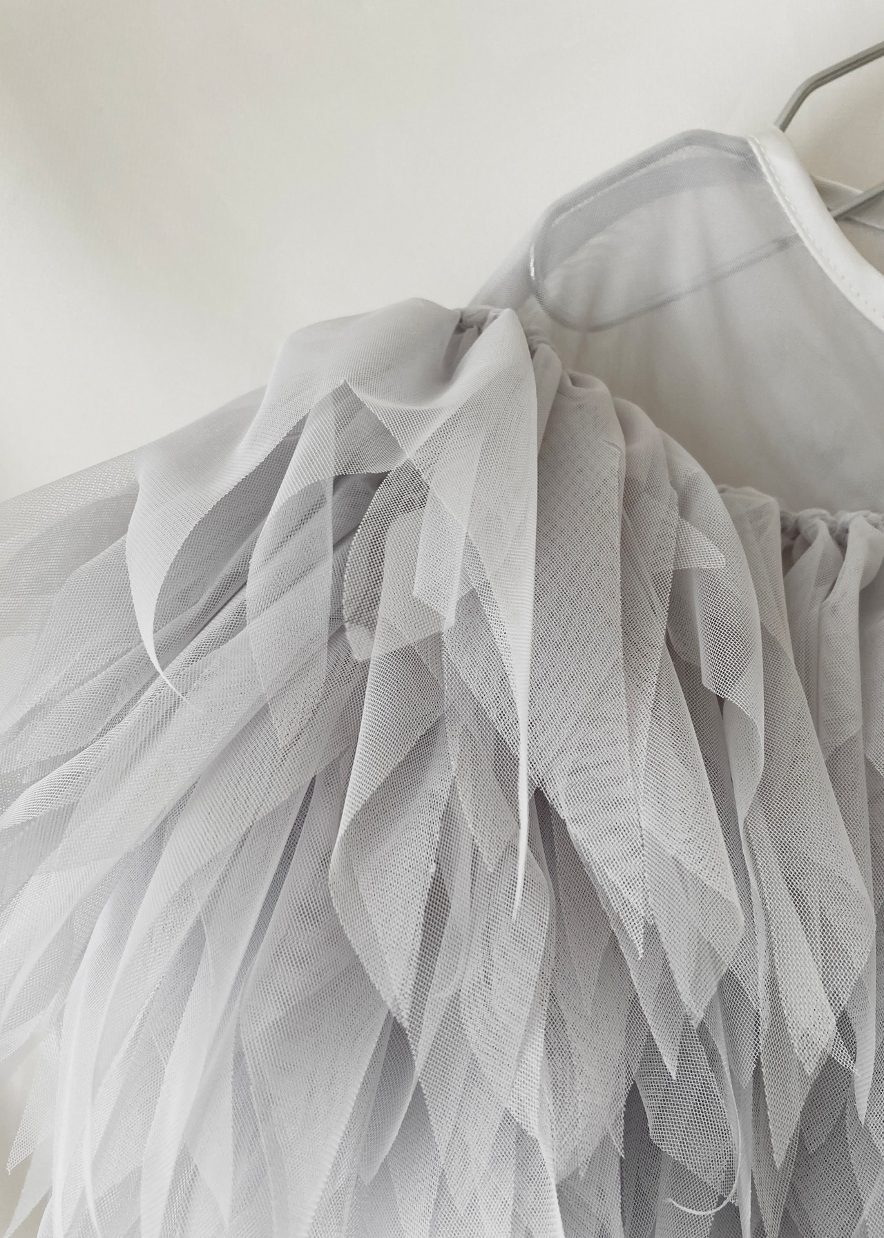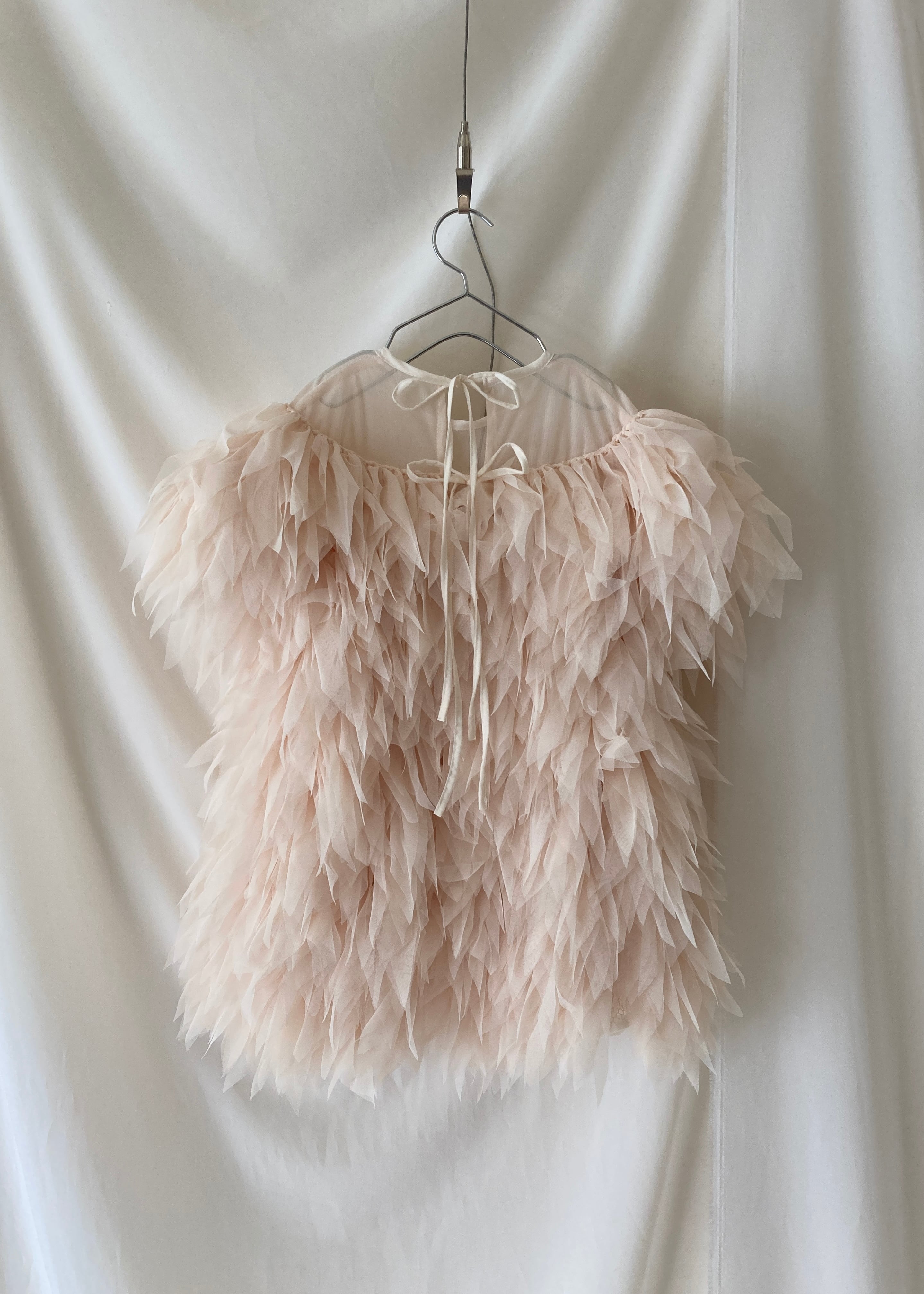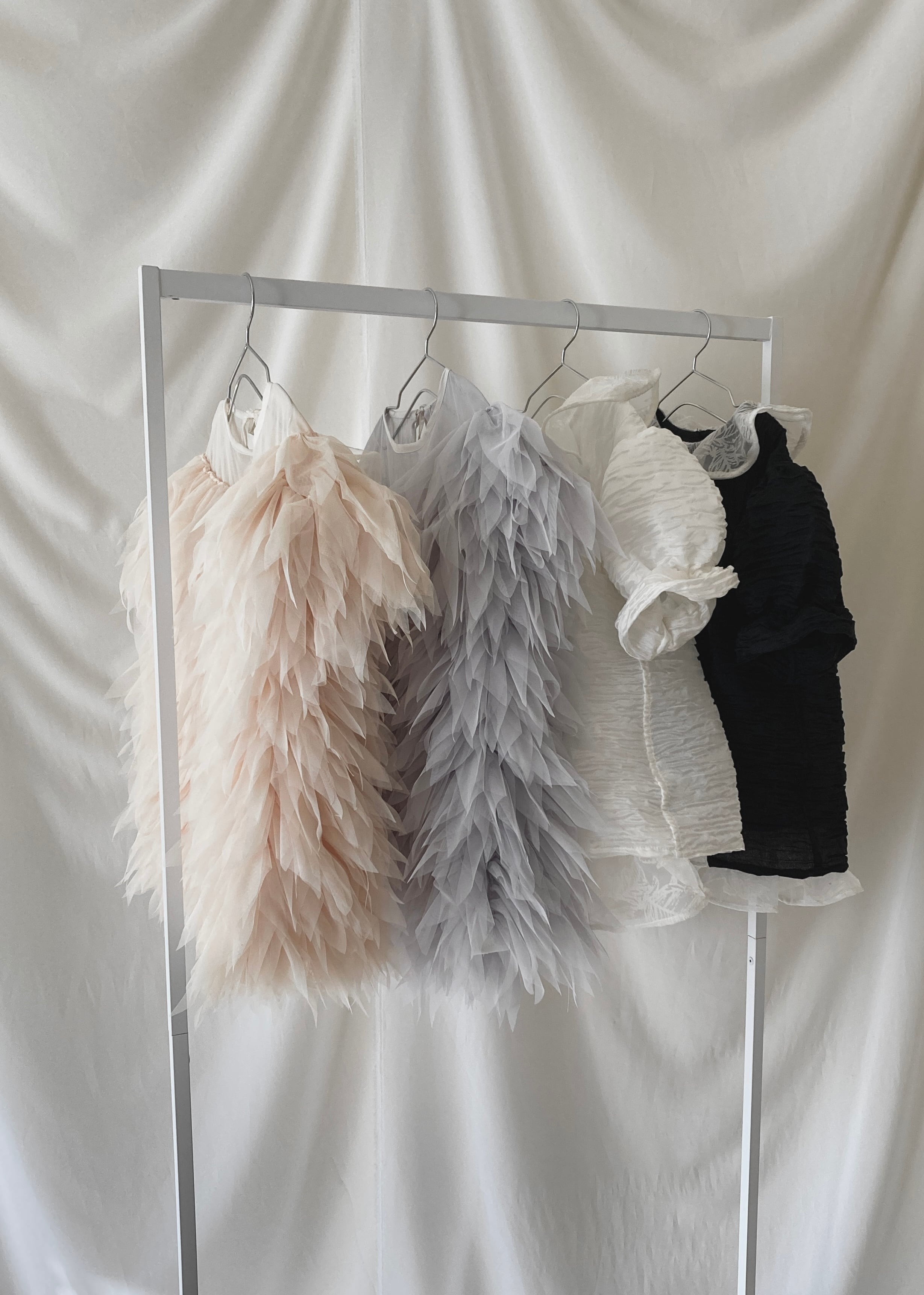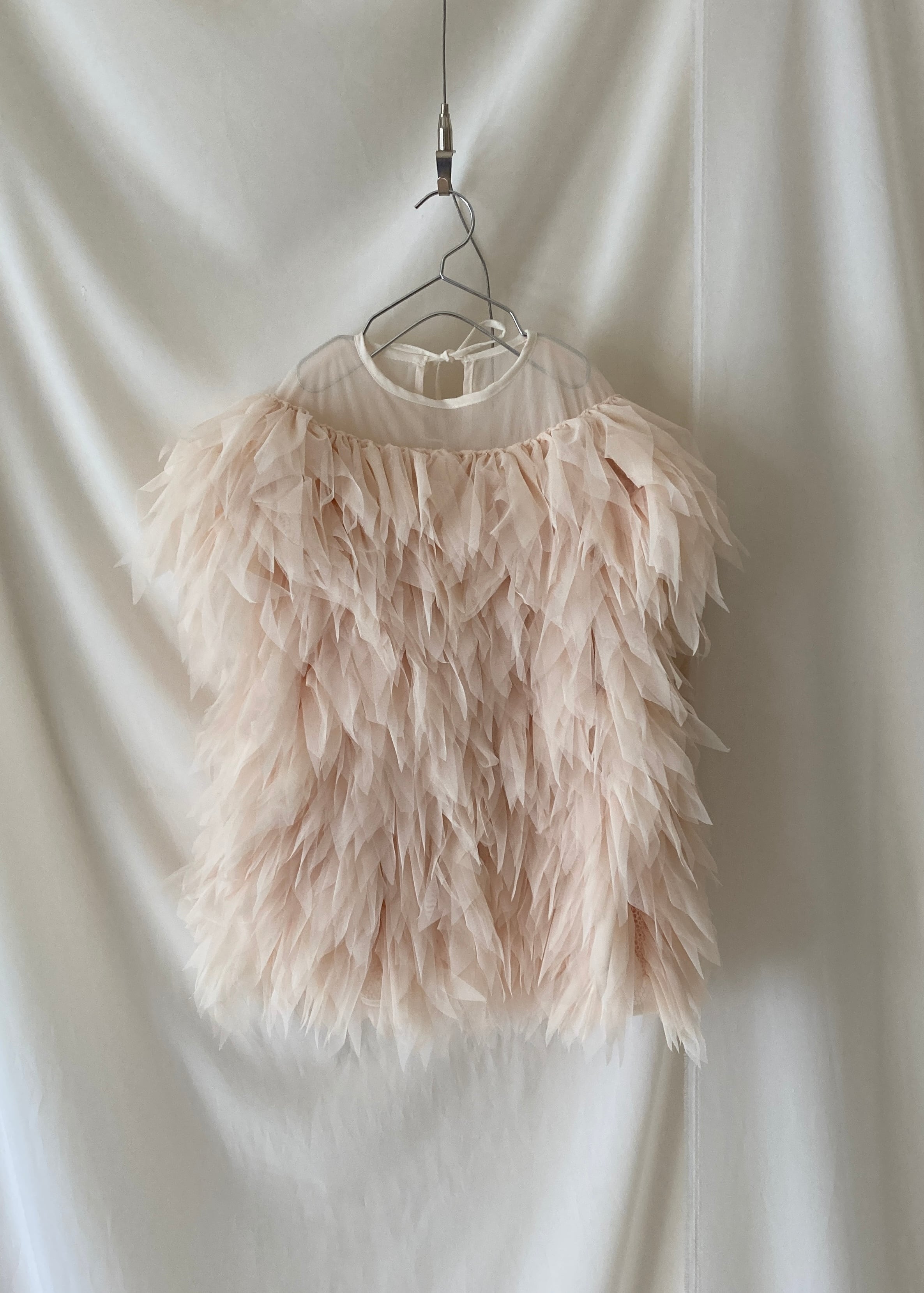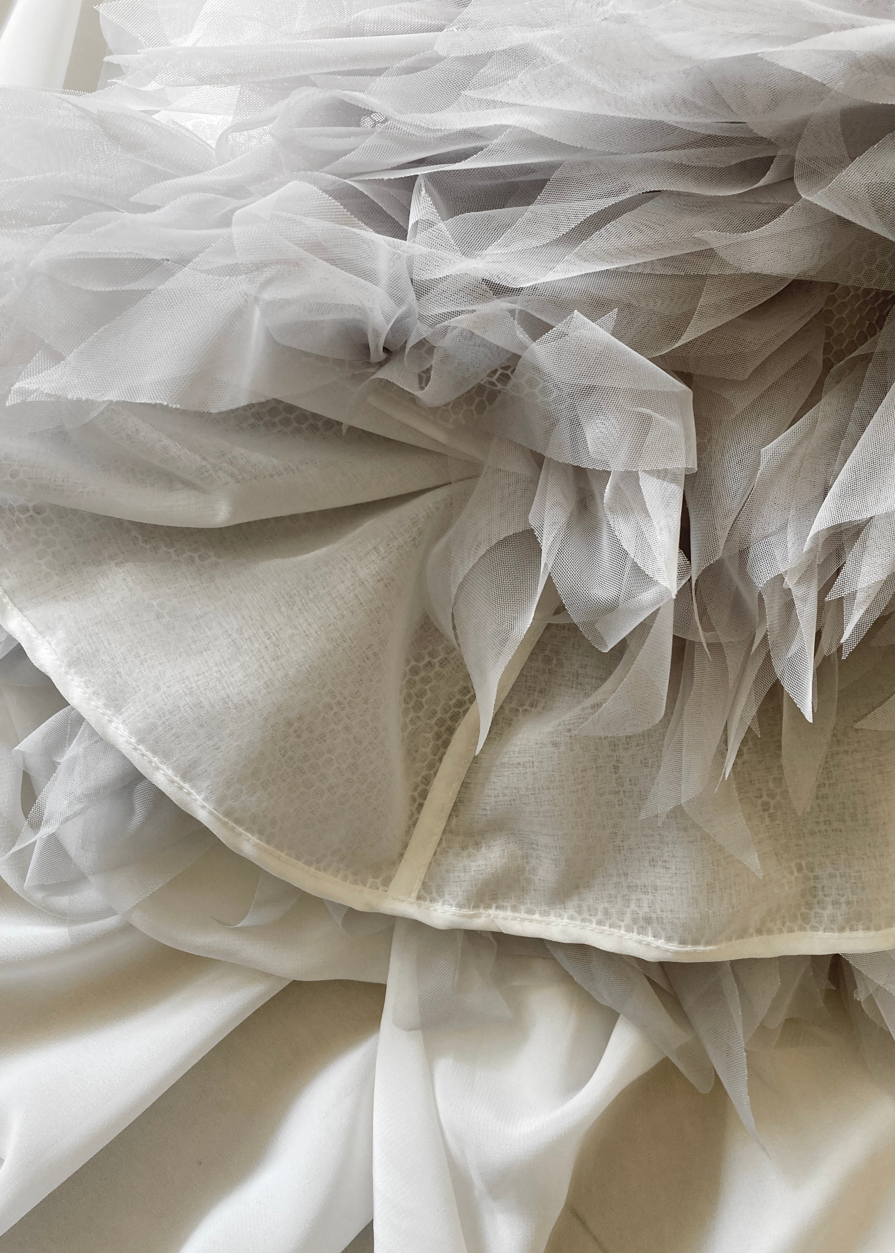 羽のようにカットしたチュール生地を、ニットのように編み込んで制作しています。
