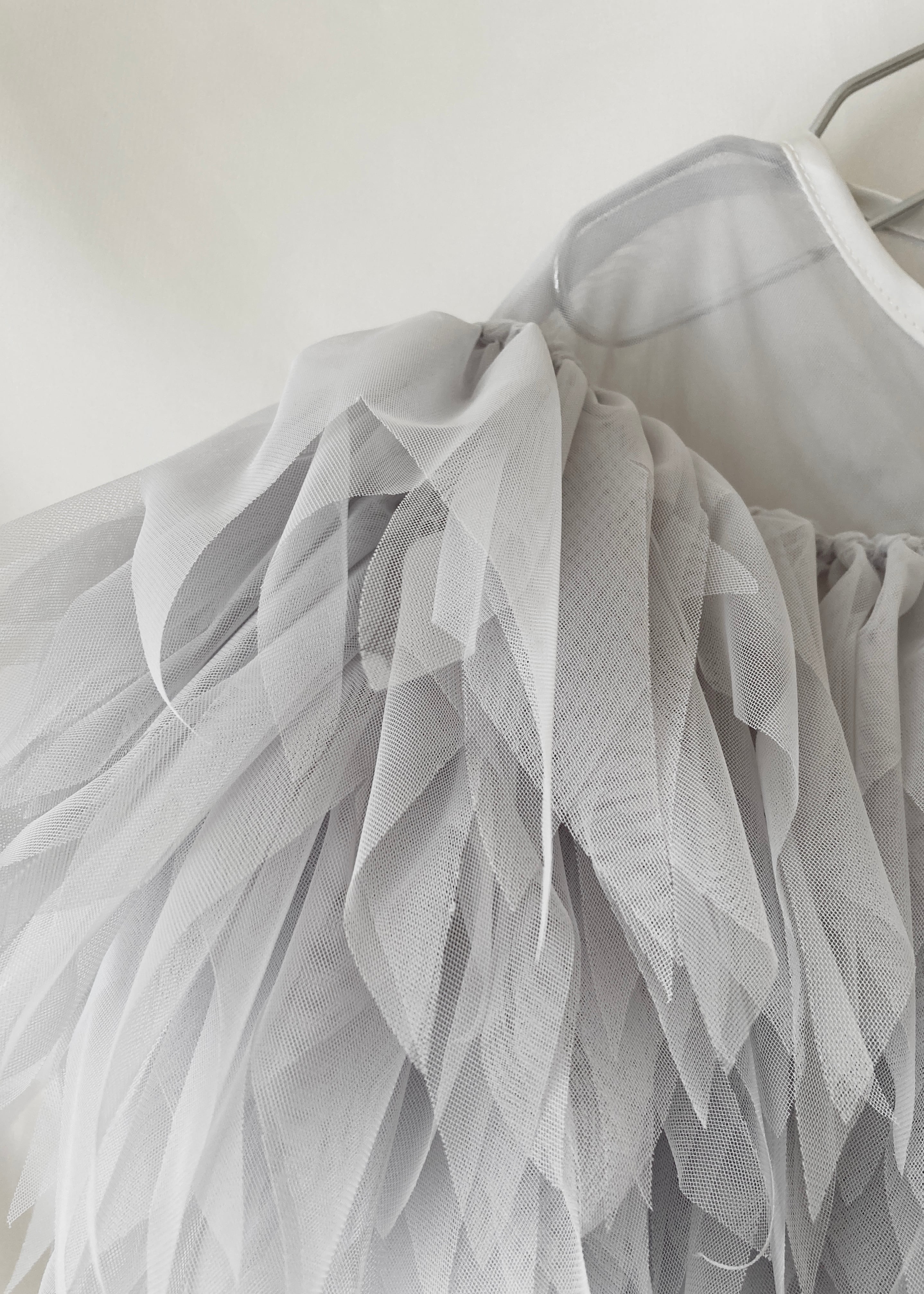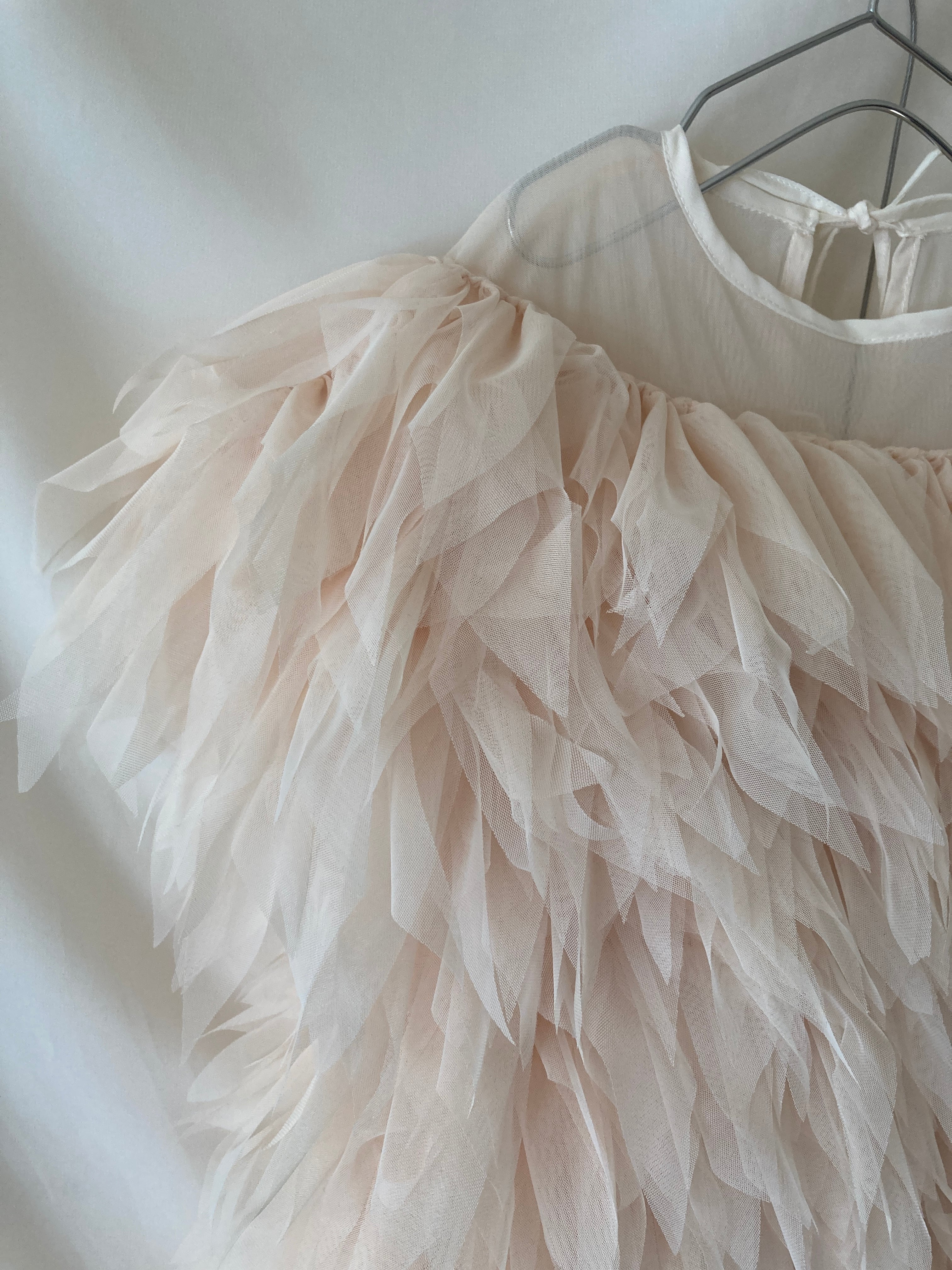 ボリューミーなチュールに包み込まれる、柔らかな印象のドレスです。
