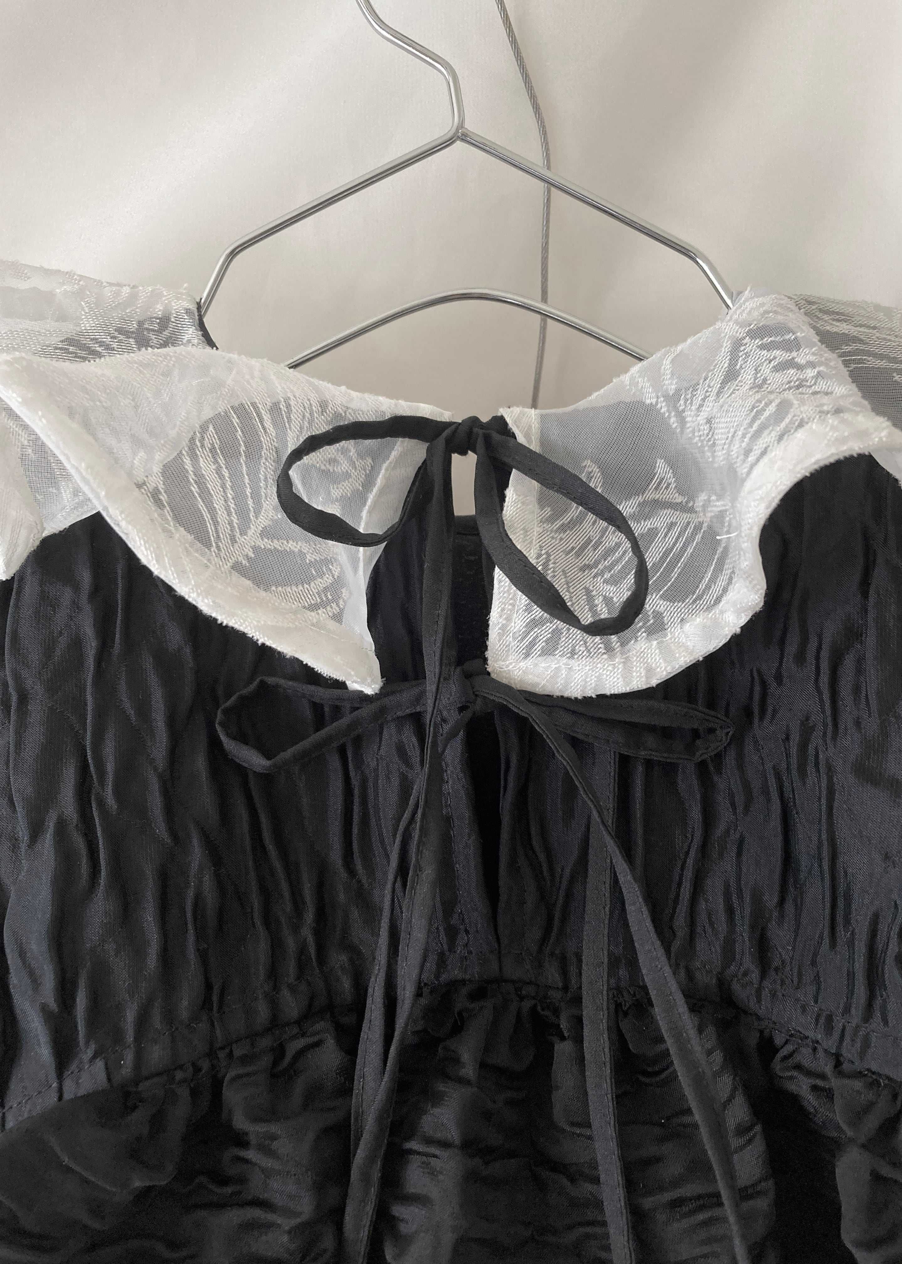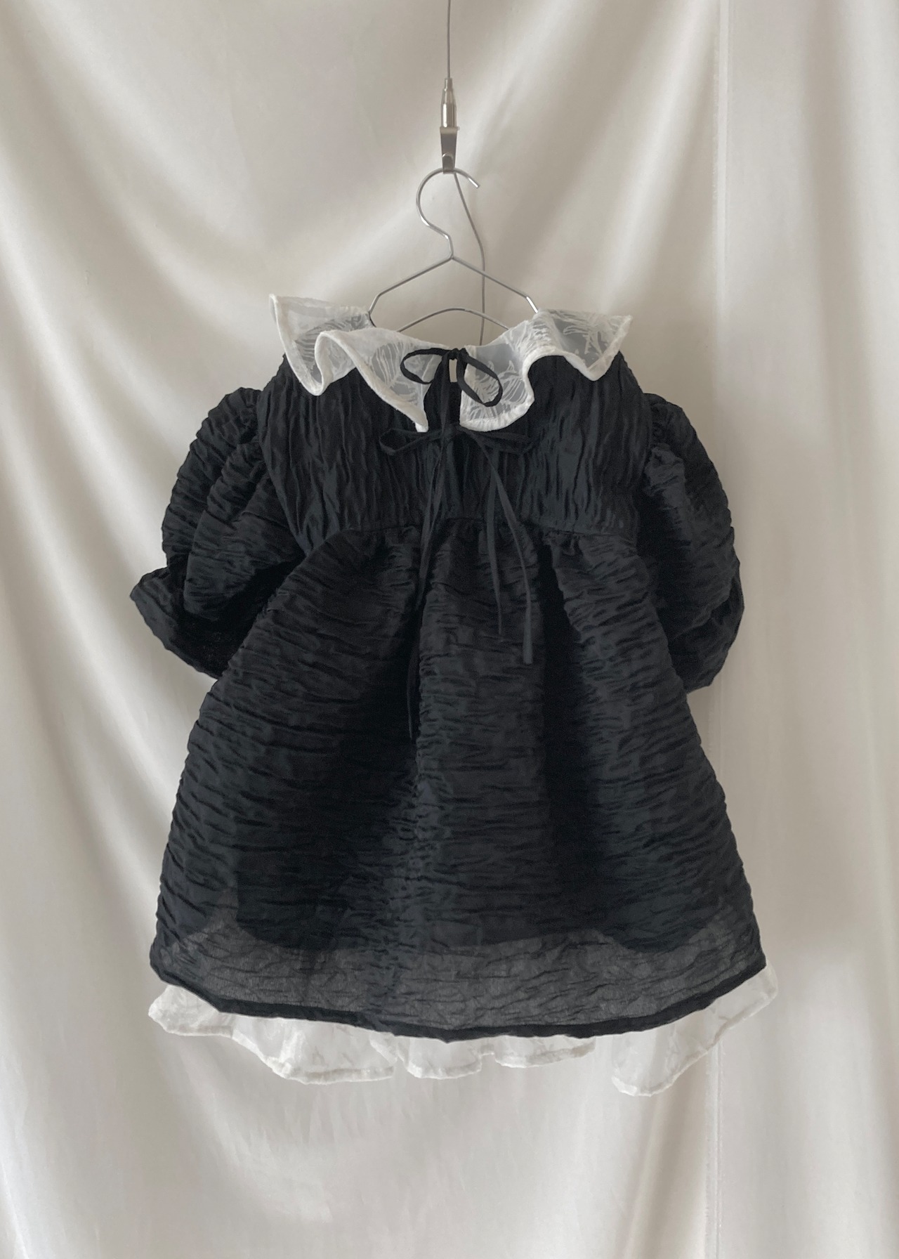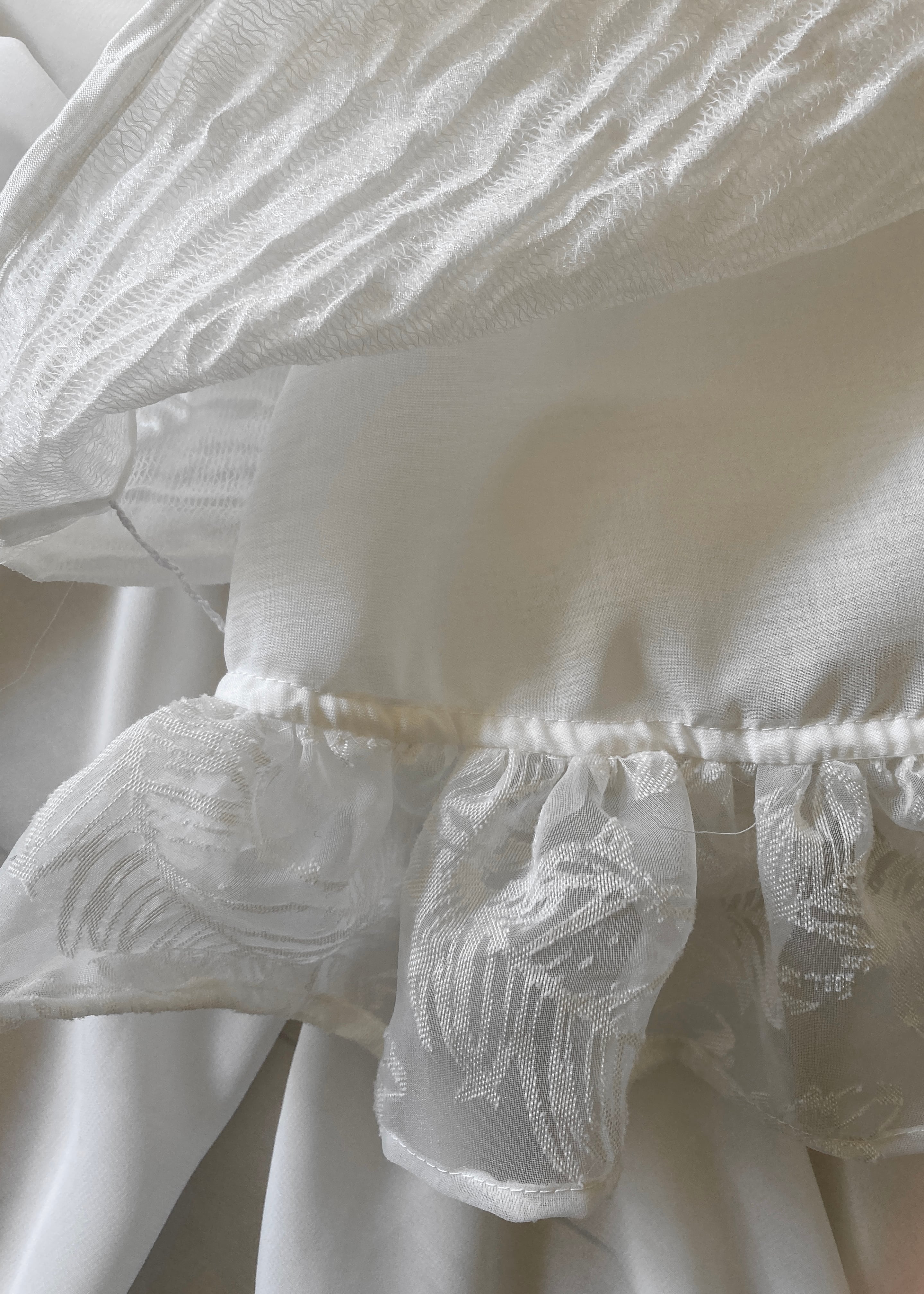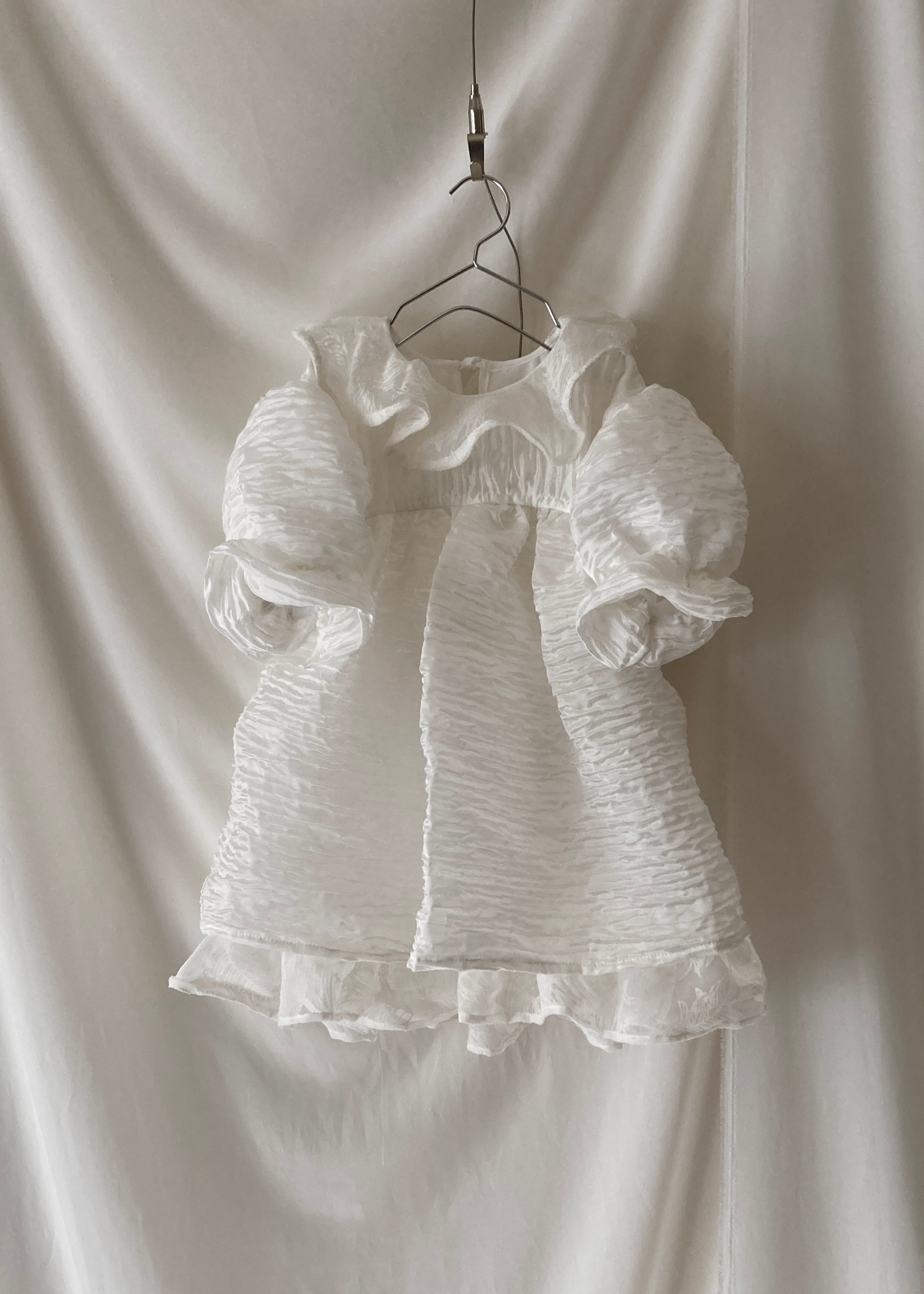 裾と襟フリルには、羽柄のオパールプリントを施したオリジナル生地を使用しました。