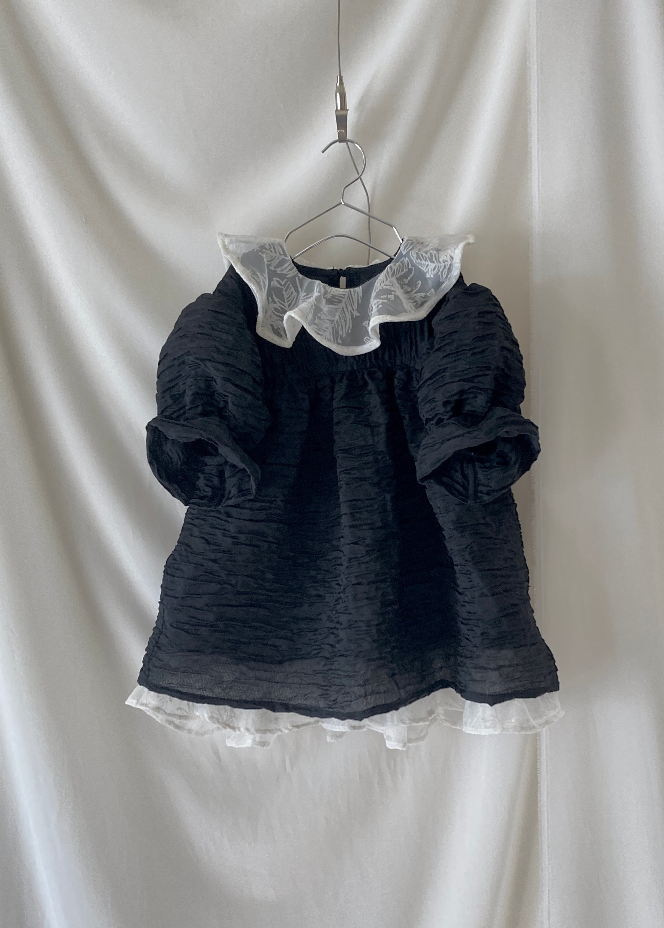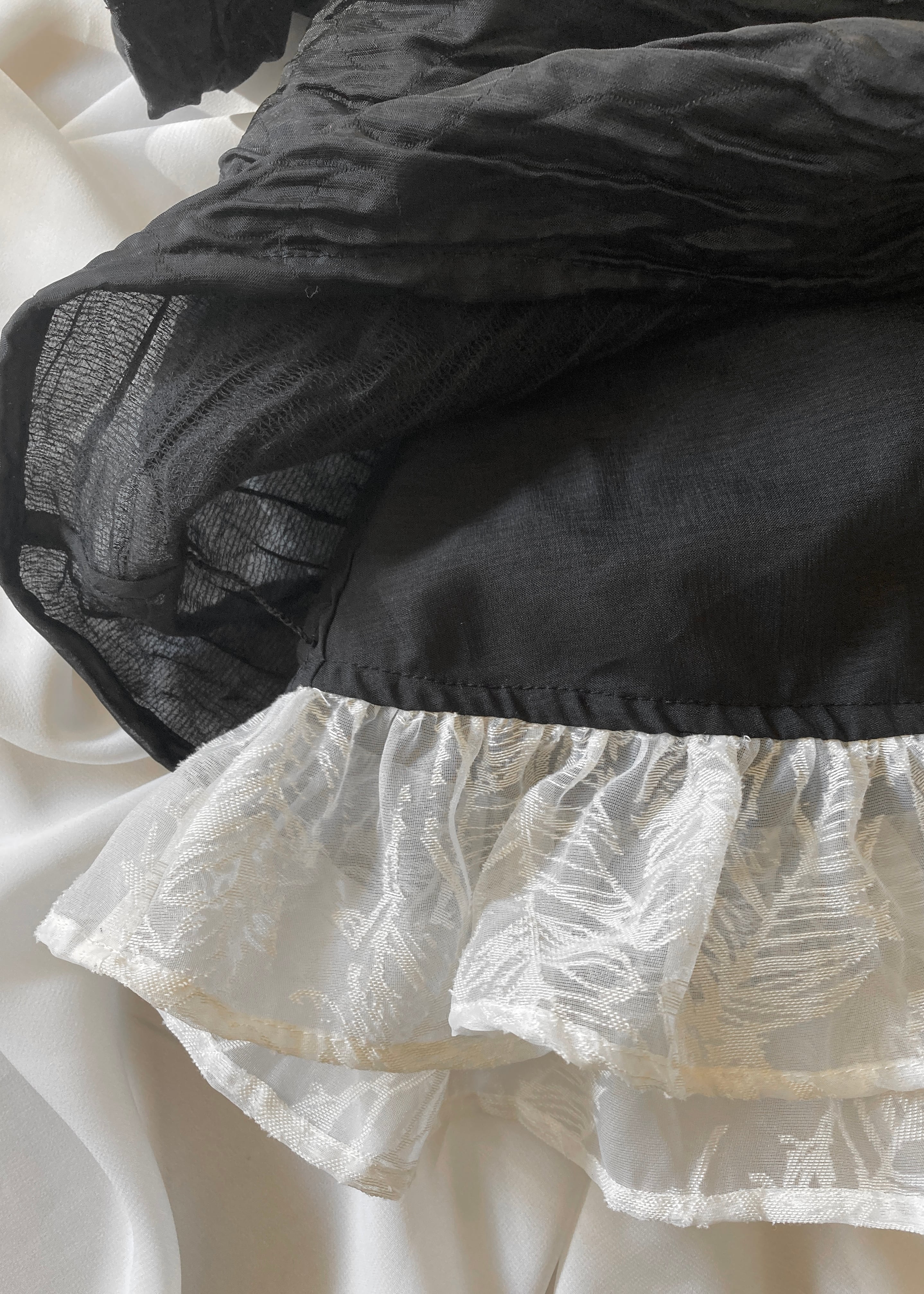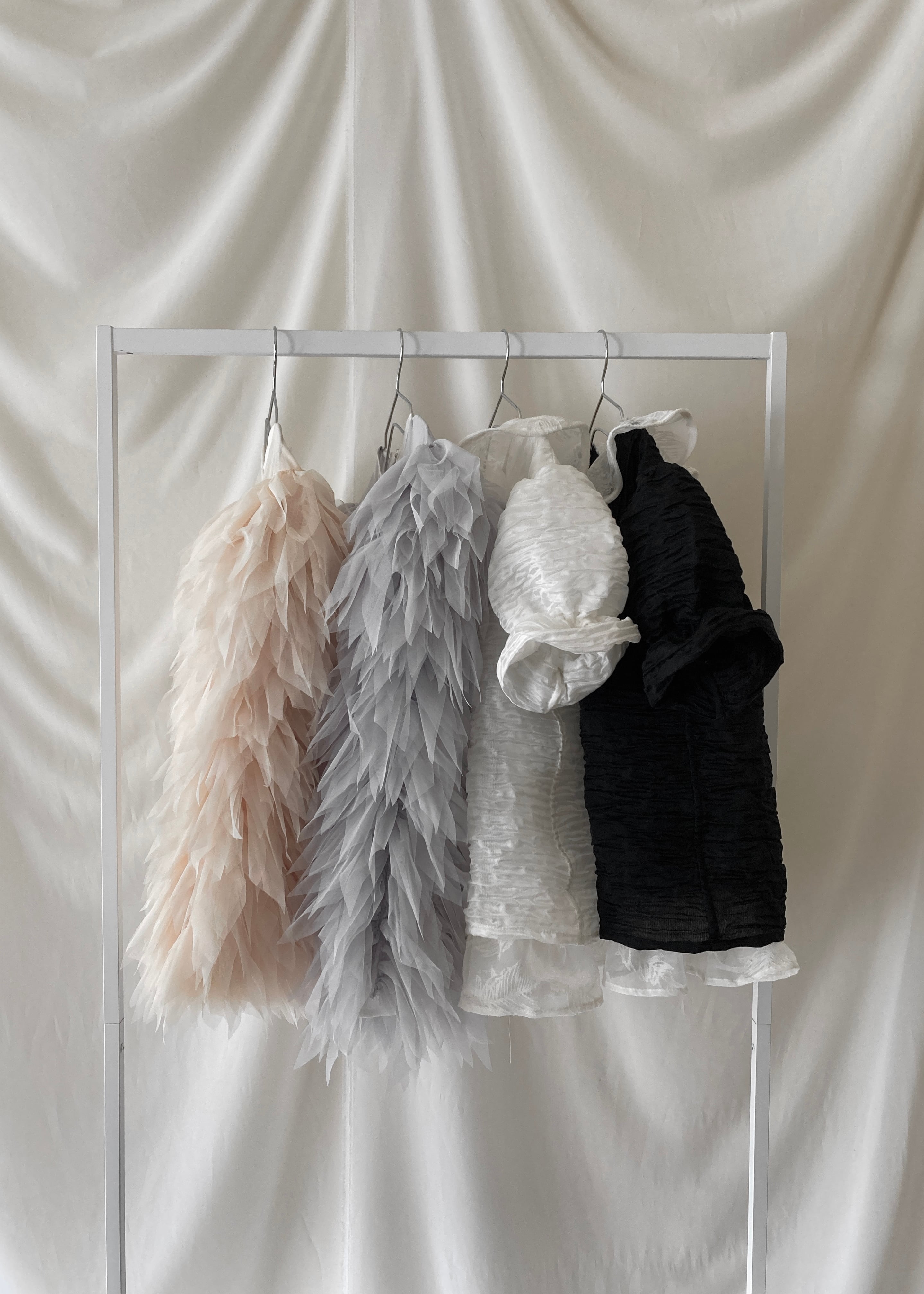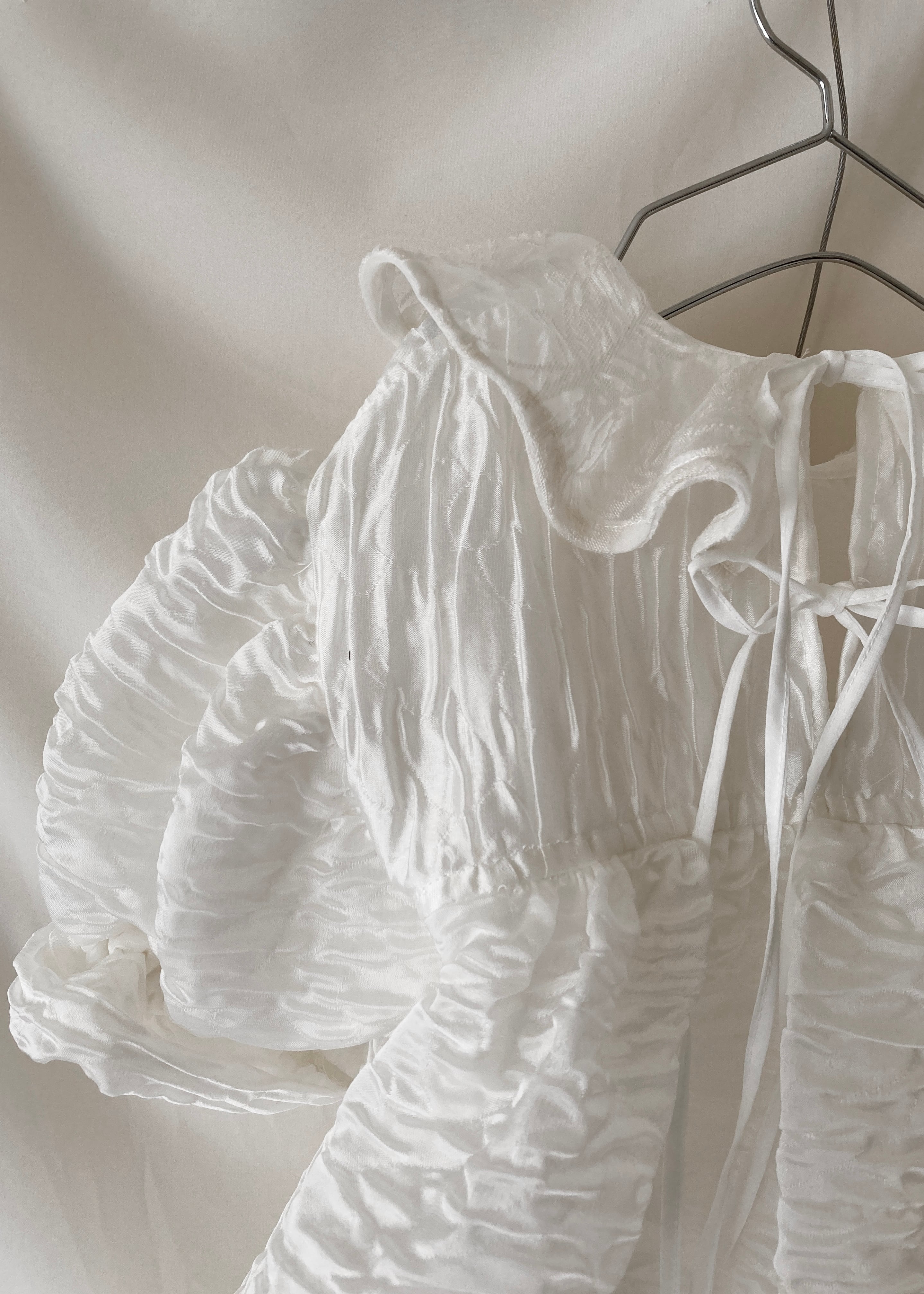 裾と襟フリルには、羽柄のオパールプリントを施したオリジナル生地を使用しました。