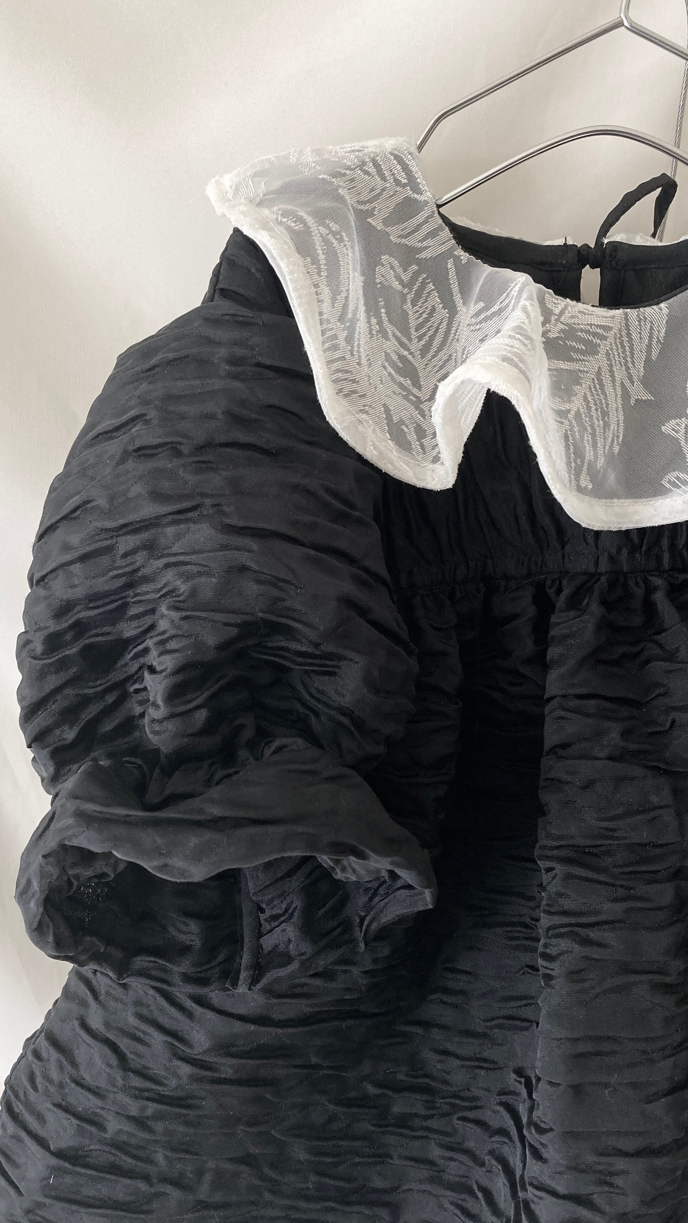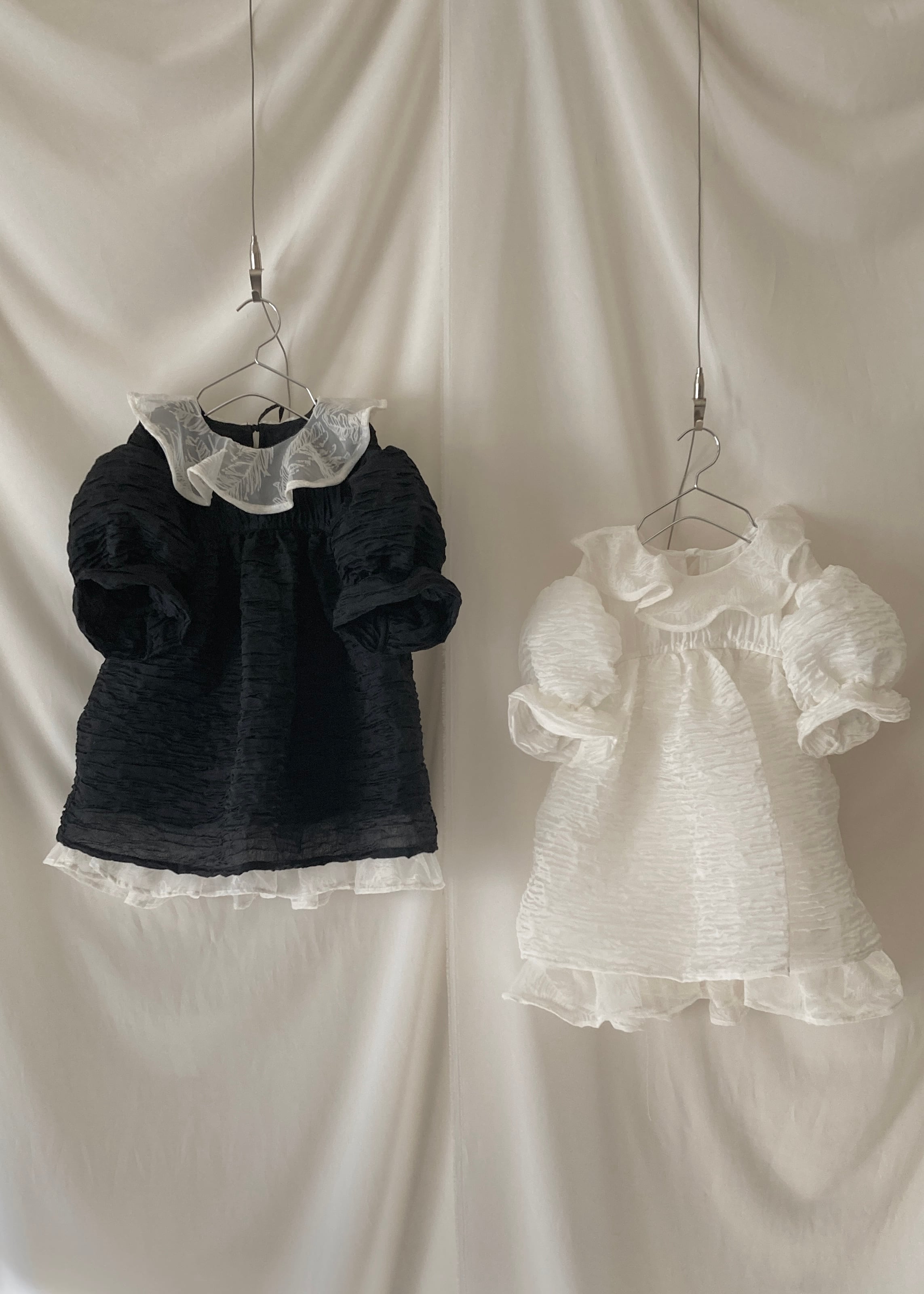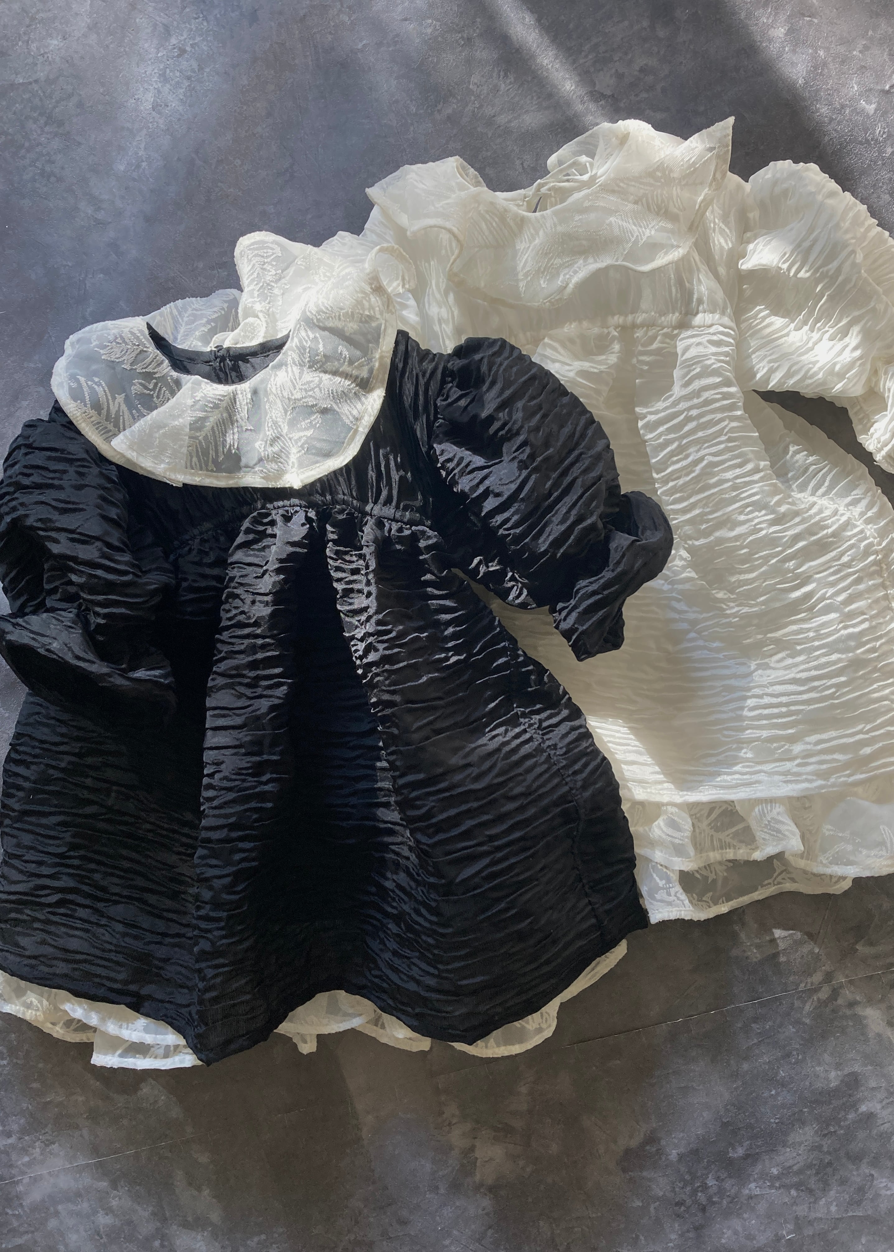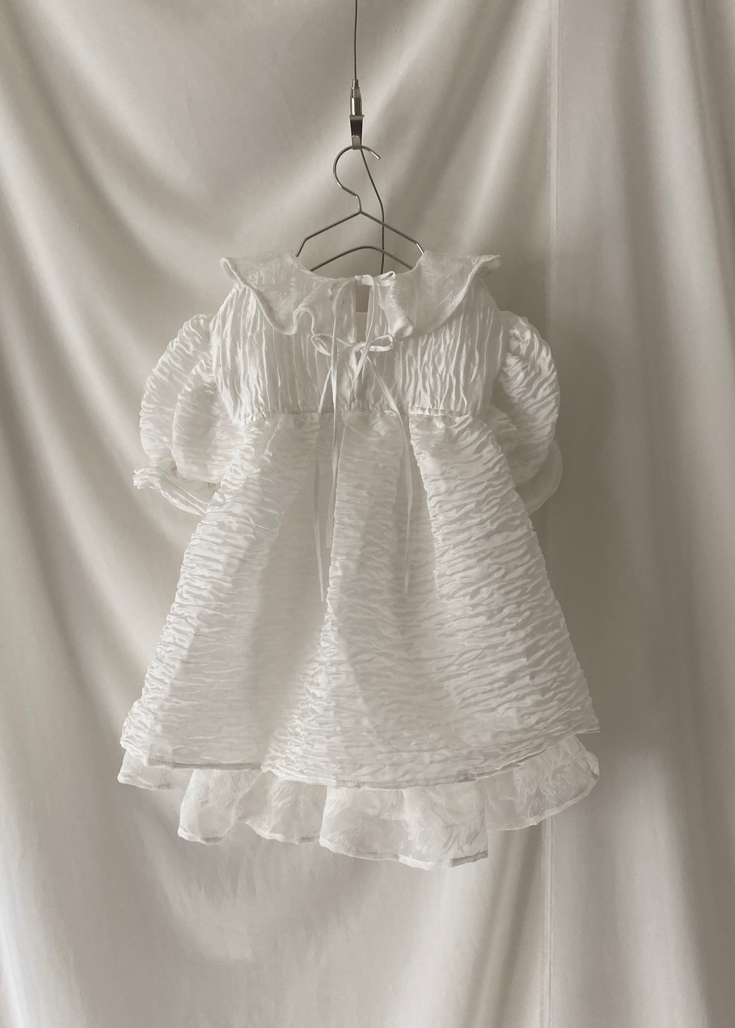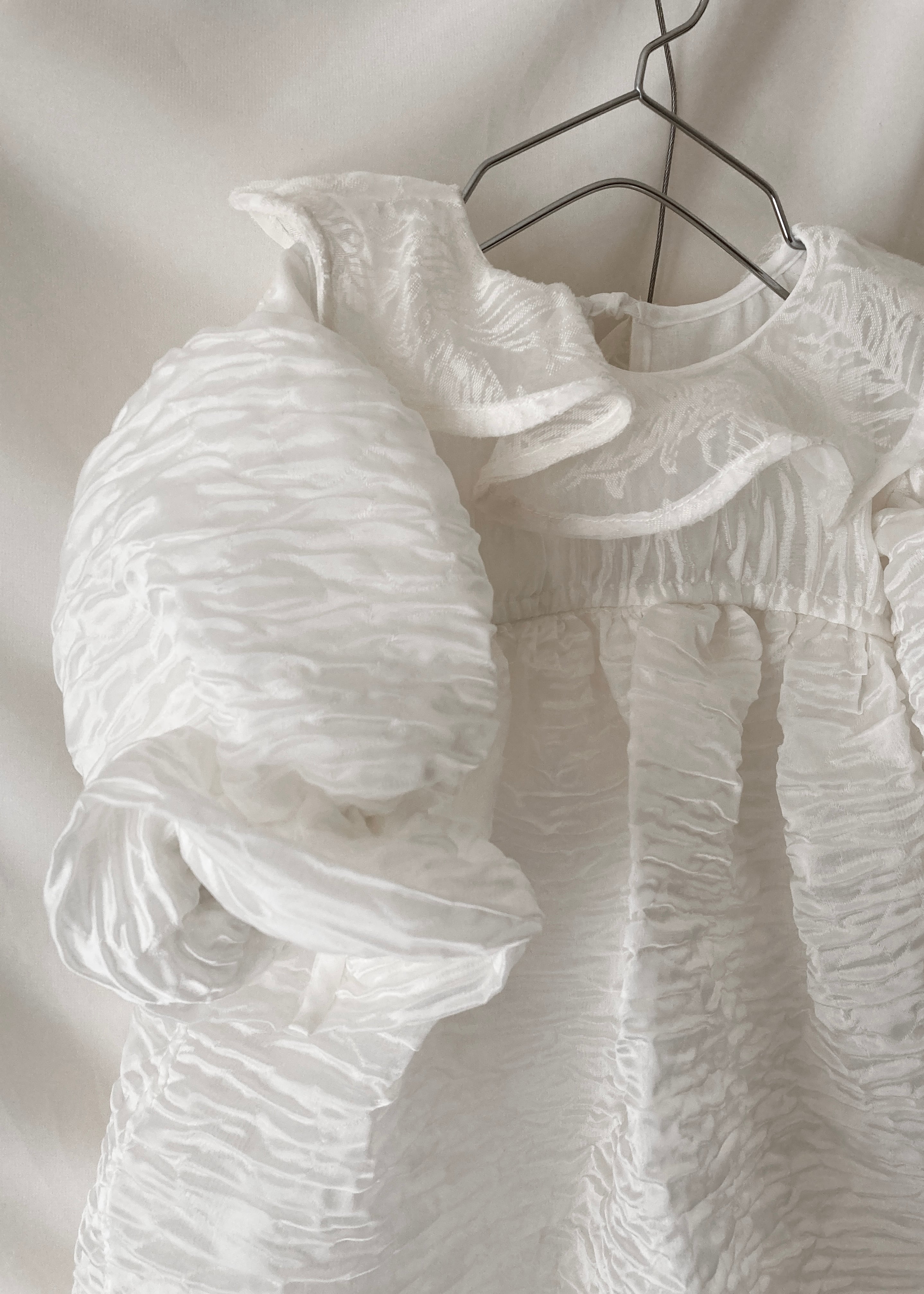 ふんわりギャザー袖のシックなベビードレス。ほんのり光沢のある、上品なジャガード生地を使用しています。