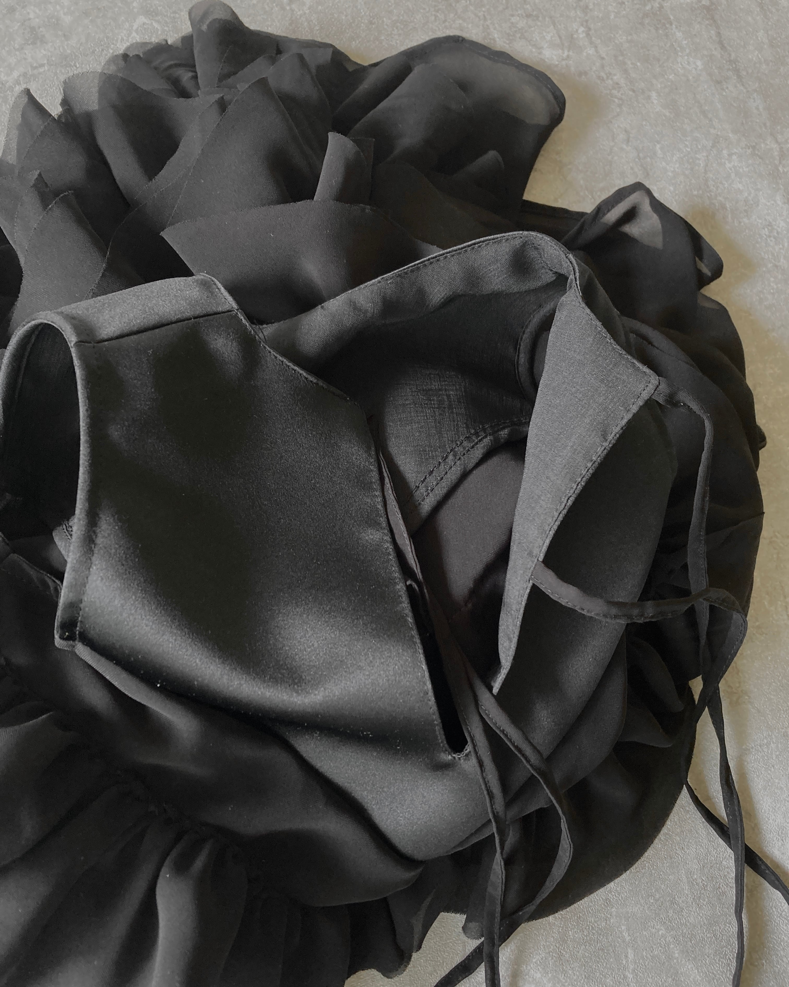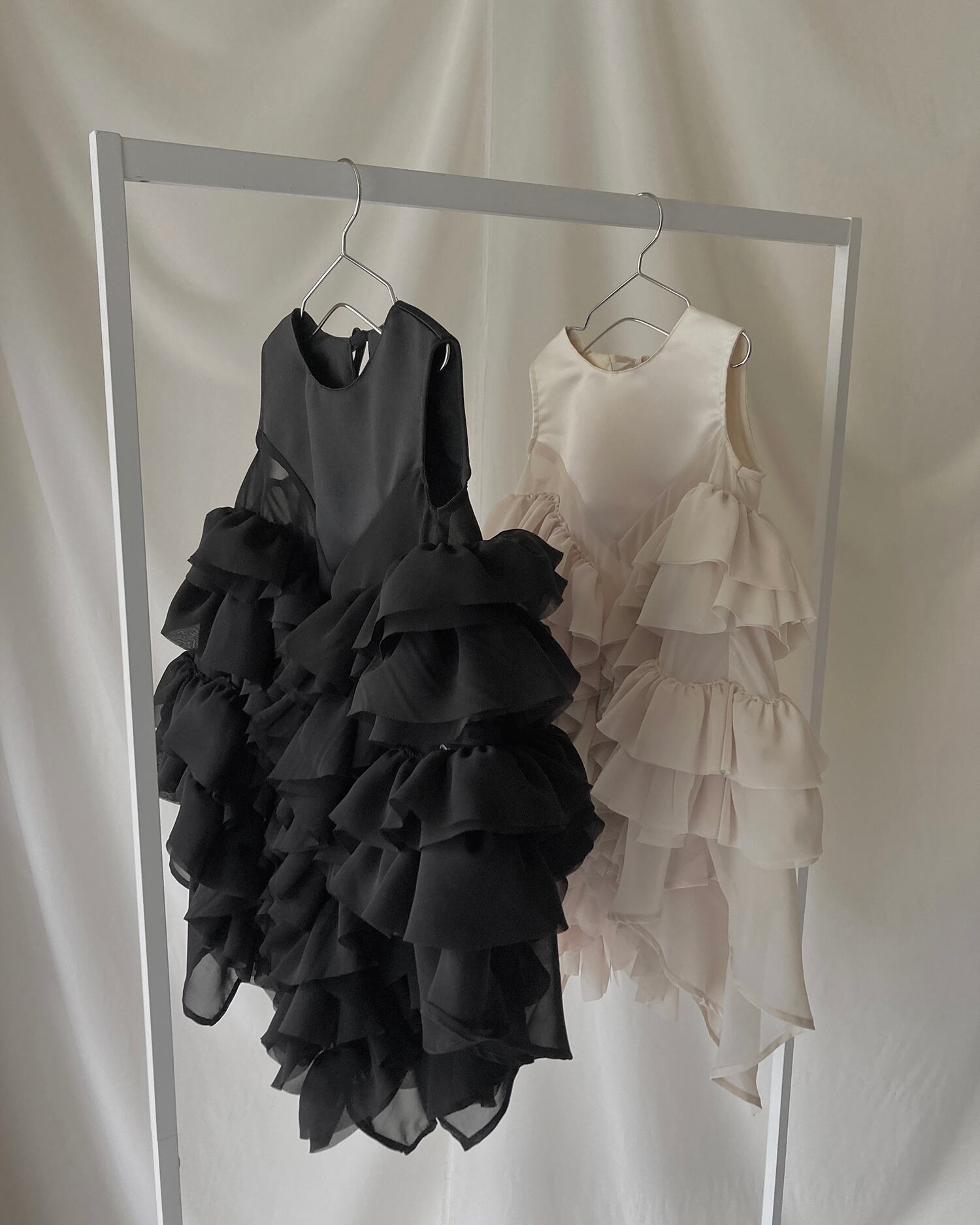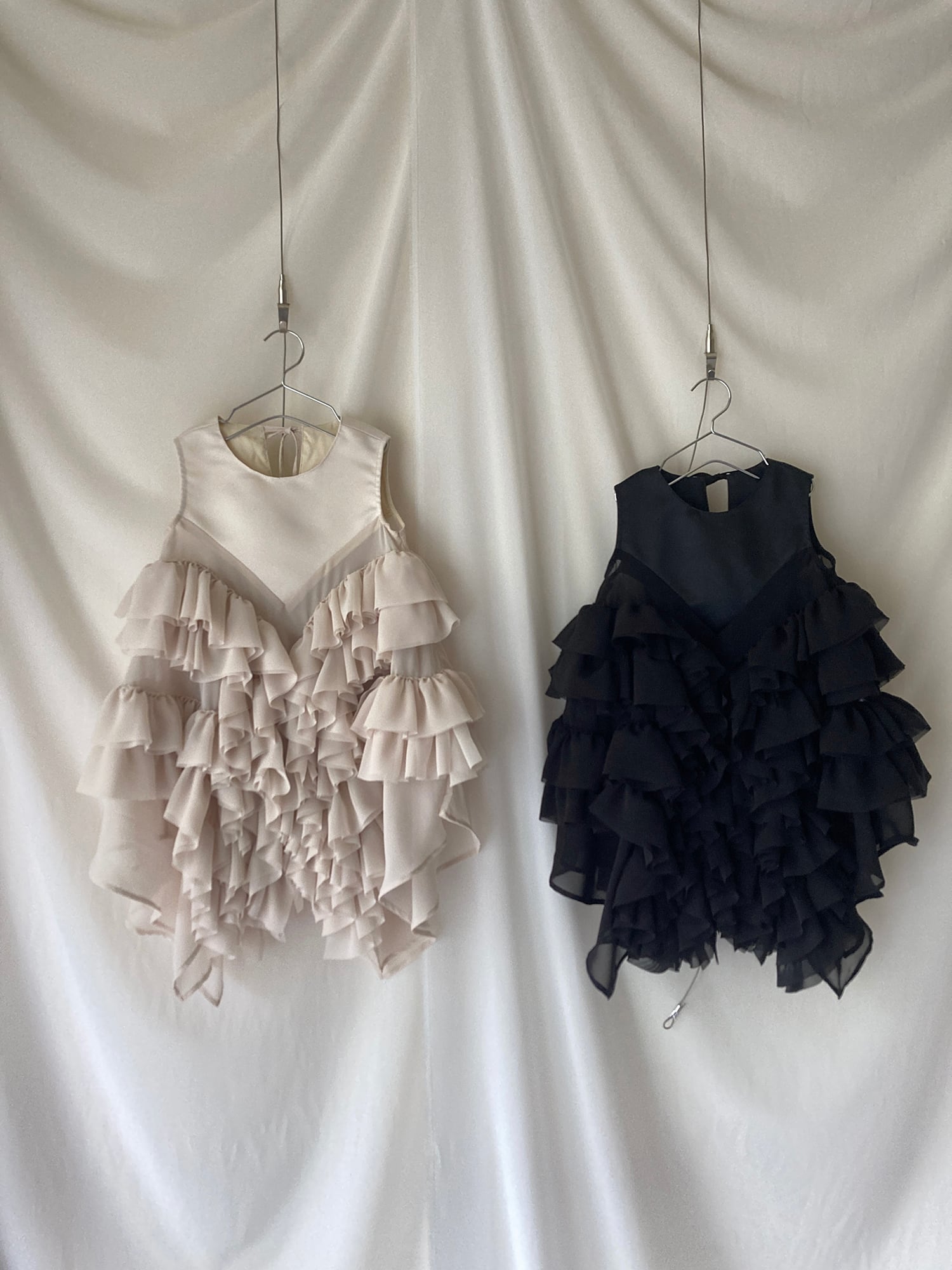 スカート部分からは軽やかなシフォンフリルで切り替えたドレスです